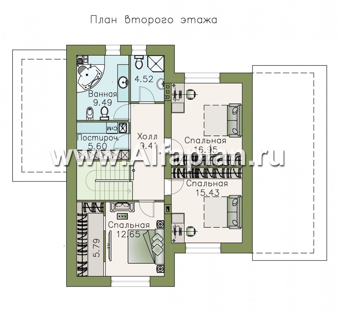 Второй этаж коттеджа из кирпича или газобетона отдан под приватные зоны. Здесь находятся три спальные комнаты, большая ванная и отдельное помещение под прачечную. Холл второго этажа довольно просторный, при необходимости его можно оборудовать встроенными шкафами для гардероба.