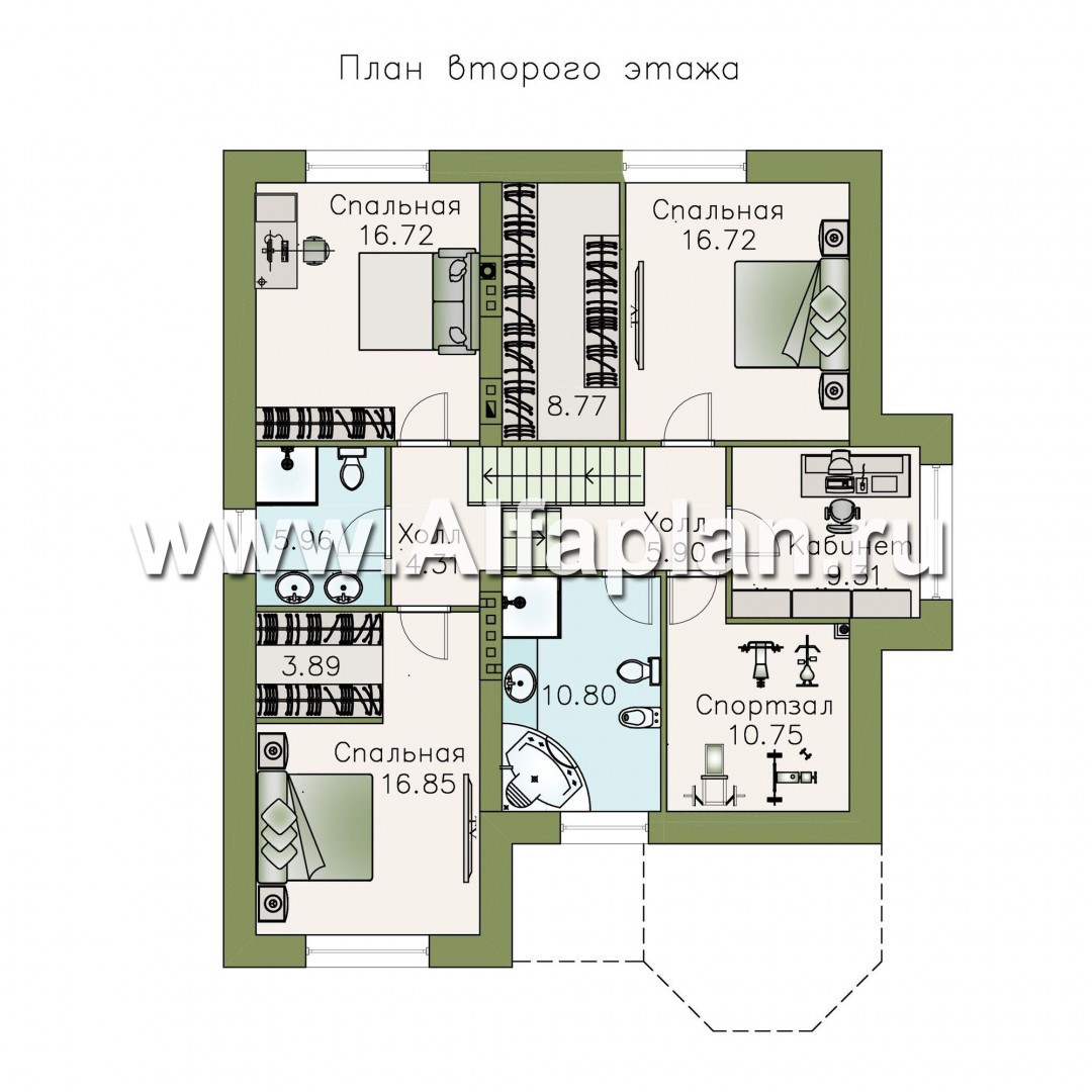 На втором этаже можно увидеть три вместительные спальные комнаты метражом более 16 квадратных метров каждая. Людей, следящим за своим здоровьем и физическим состоянием тела, заинтересует факт наличия спортзала, где можно разместить все необходимые тренажеры. Второй уровень коттеджа снабжен также личным кабинетом, который позволит в тишине заняться решением важных деловых вопросов.