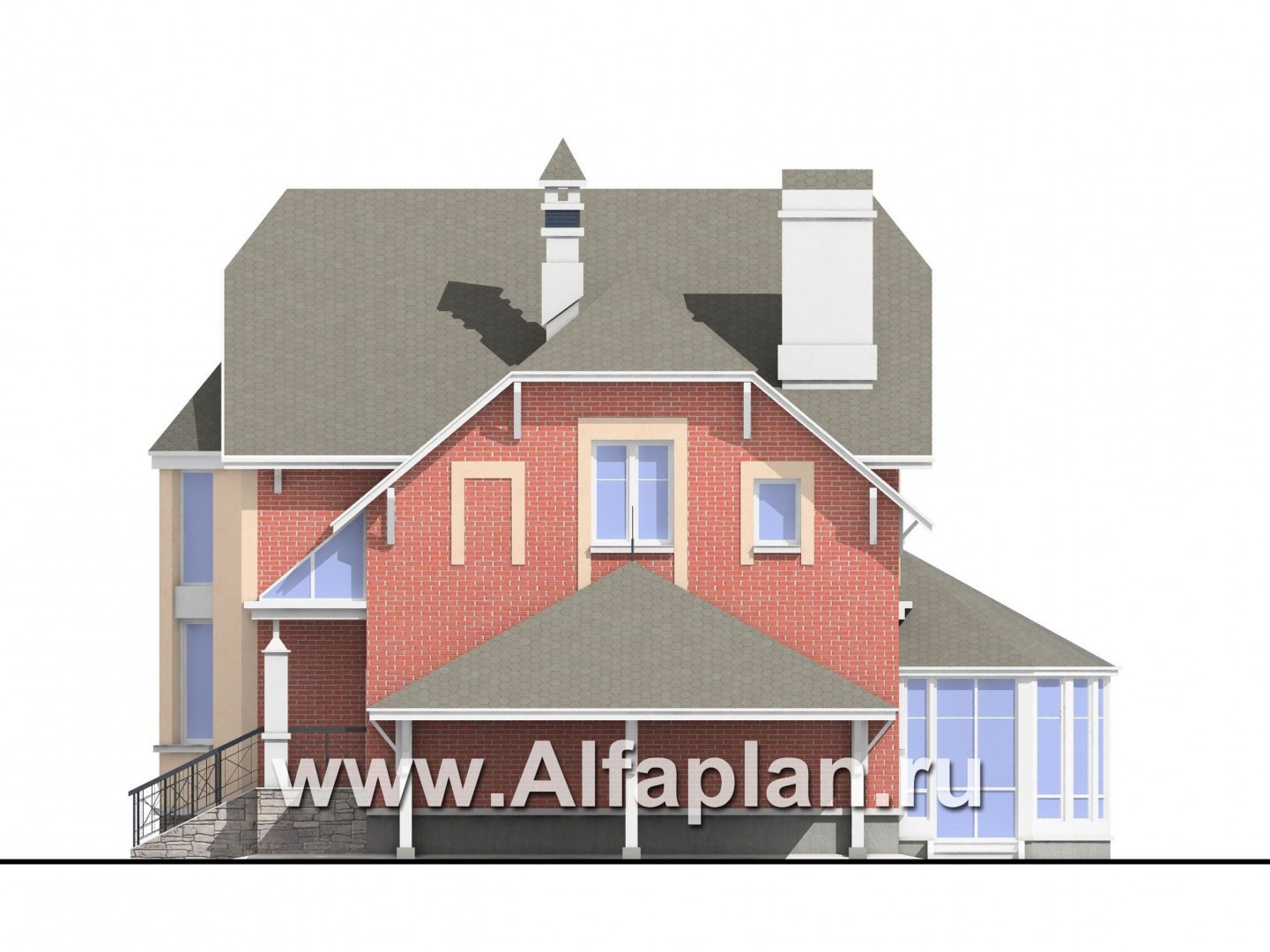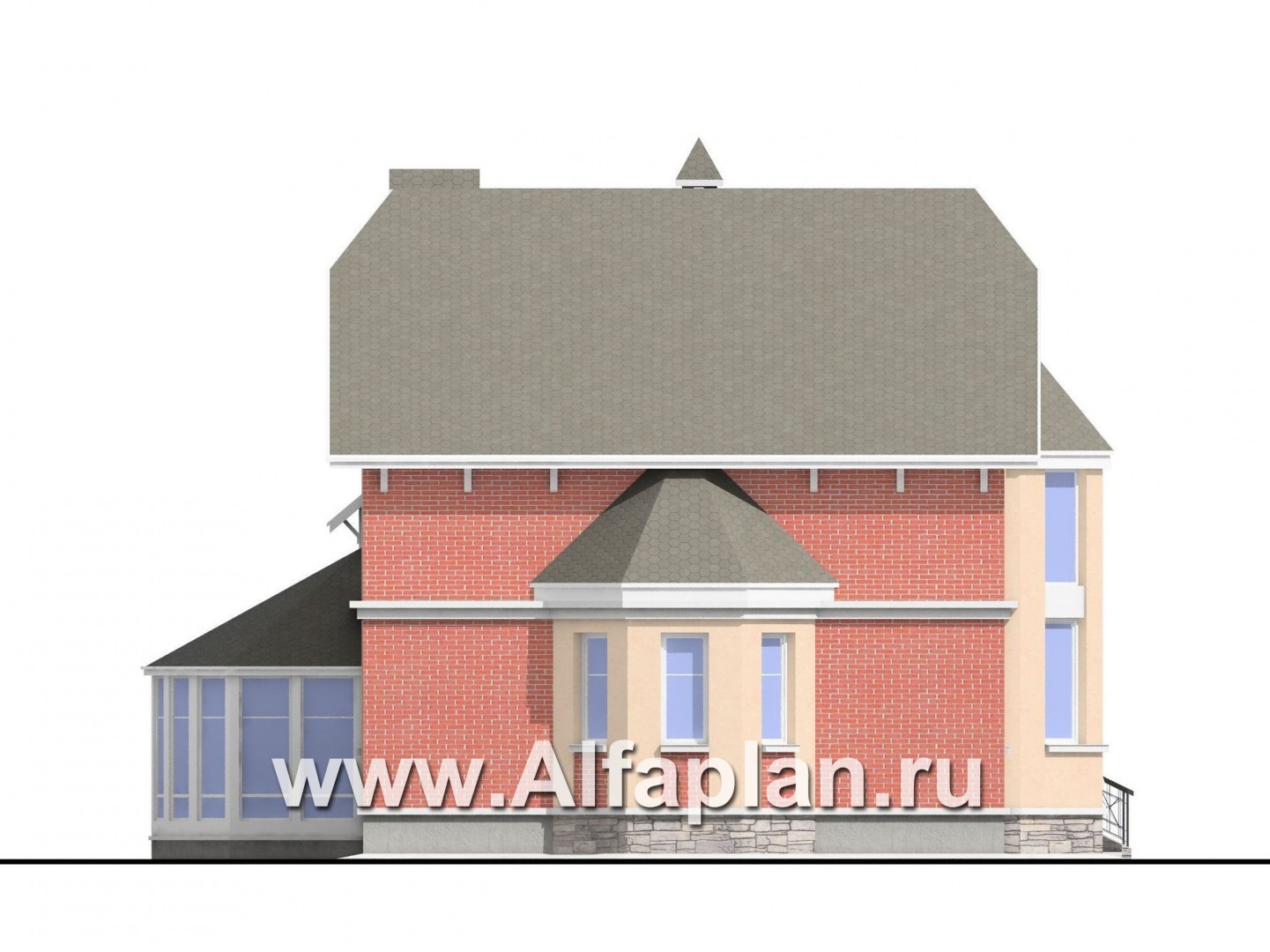 Облик дома формирует высокий эркер с большой площадью остекления, проходящий через два этажа. Современная планировка данного коттеджа имеет компактную структуру и максимально способствует комфортному проживанию. Парадный вид коттеджу придает в первую очередь широкая лестница с массивной колонной, а также высокий цоколь, отделанный облицовочным камнем. Удачный цветовой контраст в экстерьере коттеджа создается сочетанием цветов оштукатуренного эркера и кирпичных стен. Если дом фасадом будет смотреть на южную сторону, то наилучшая освещенность коттеджу гарантирована. Гараж для машины в данном проекте заменен на высокий, просторный навес, пристроенный к дому, что удобно и экономично.