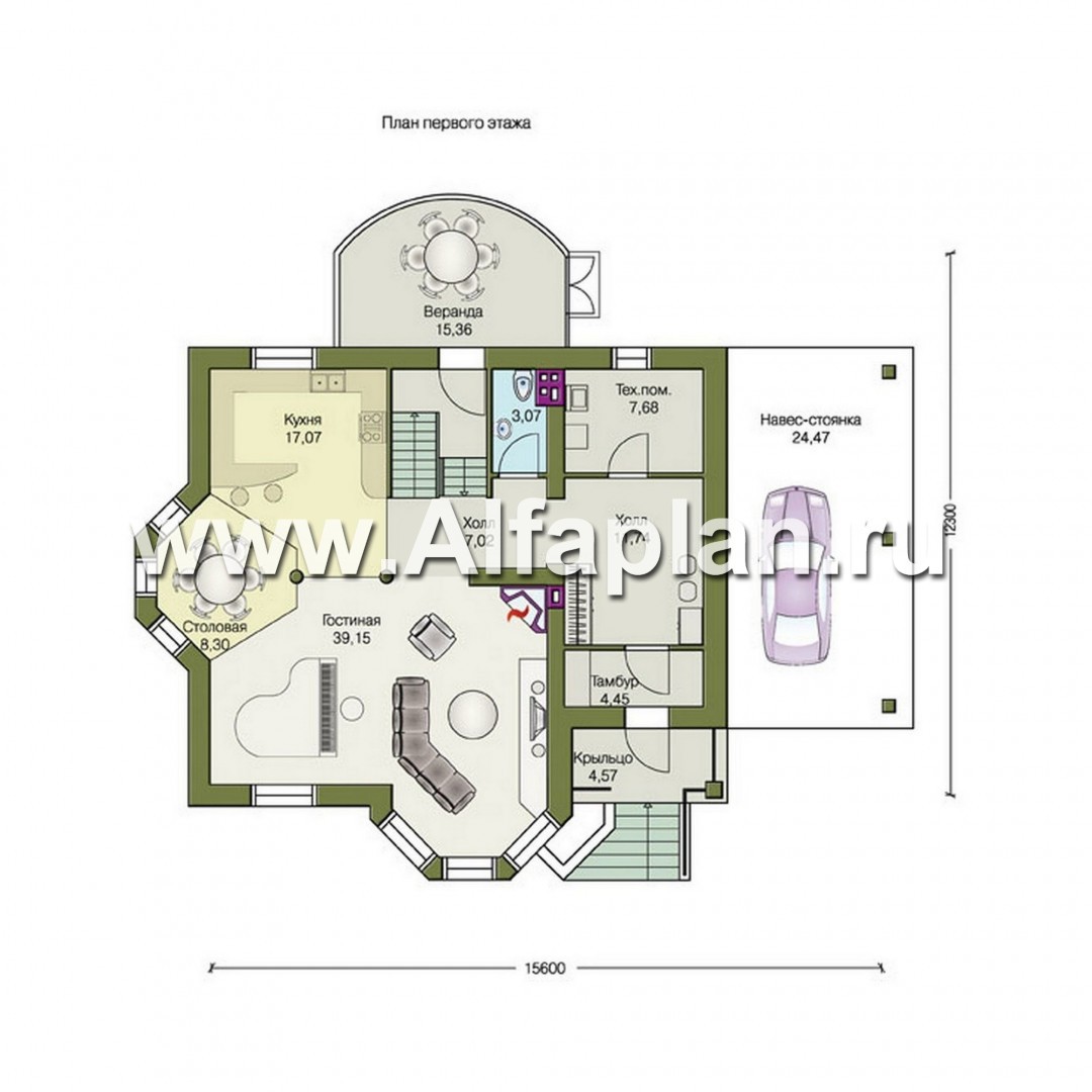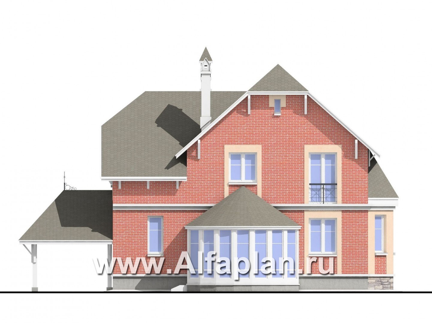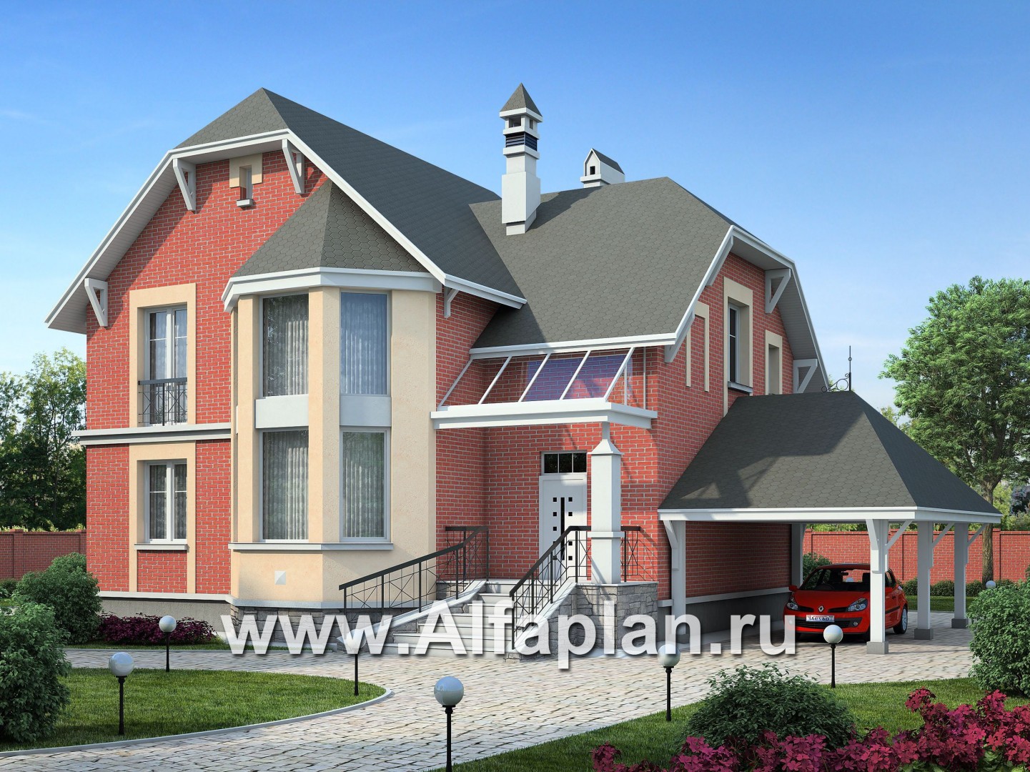 «Фаворит» - проект двухэтажного дома, планировка с эркером и двусветной гостиной, навес для авто - технические характеристики